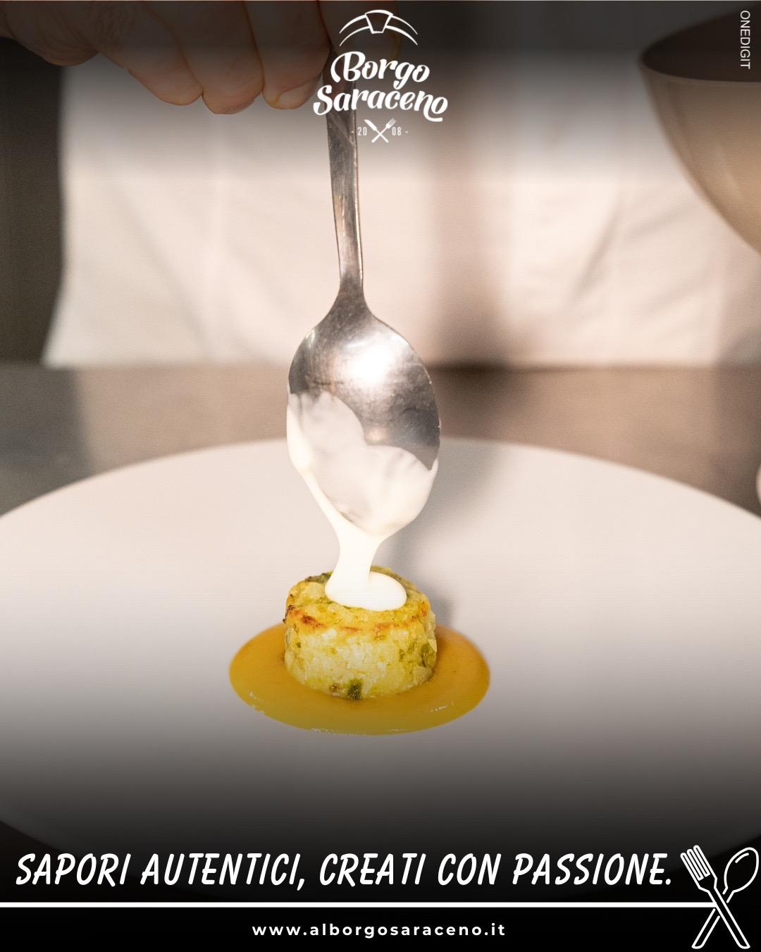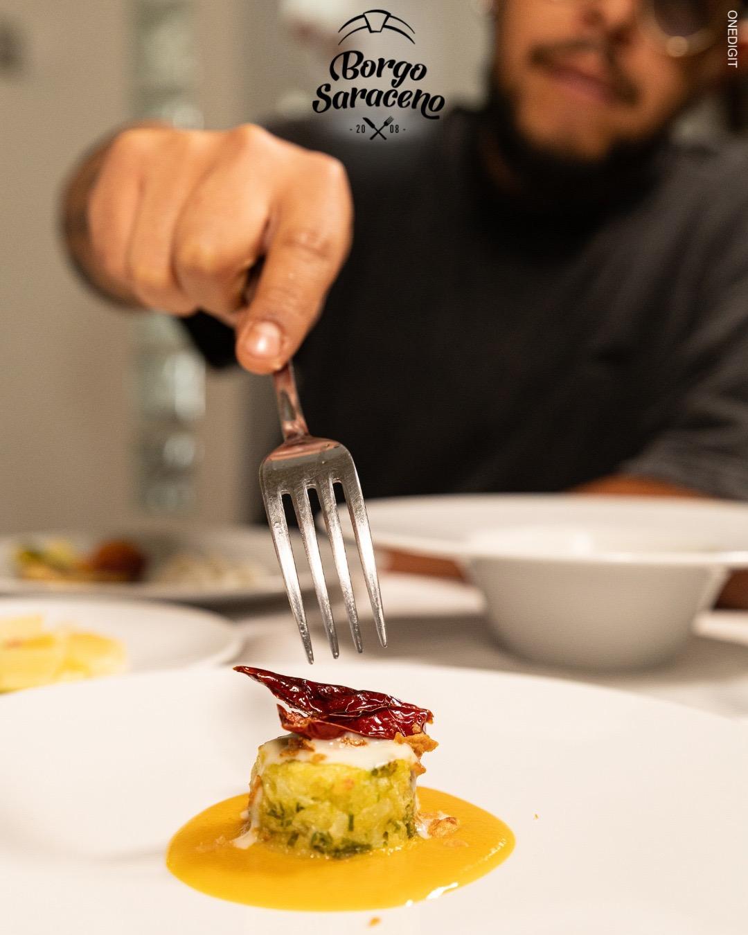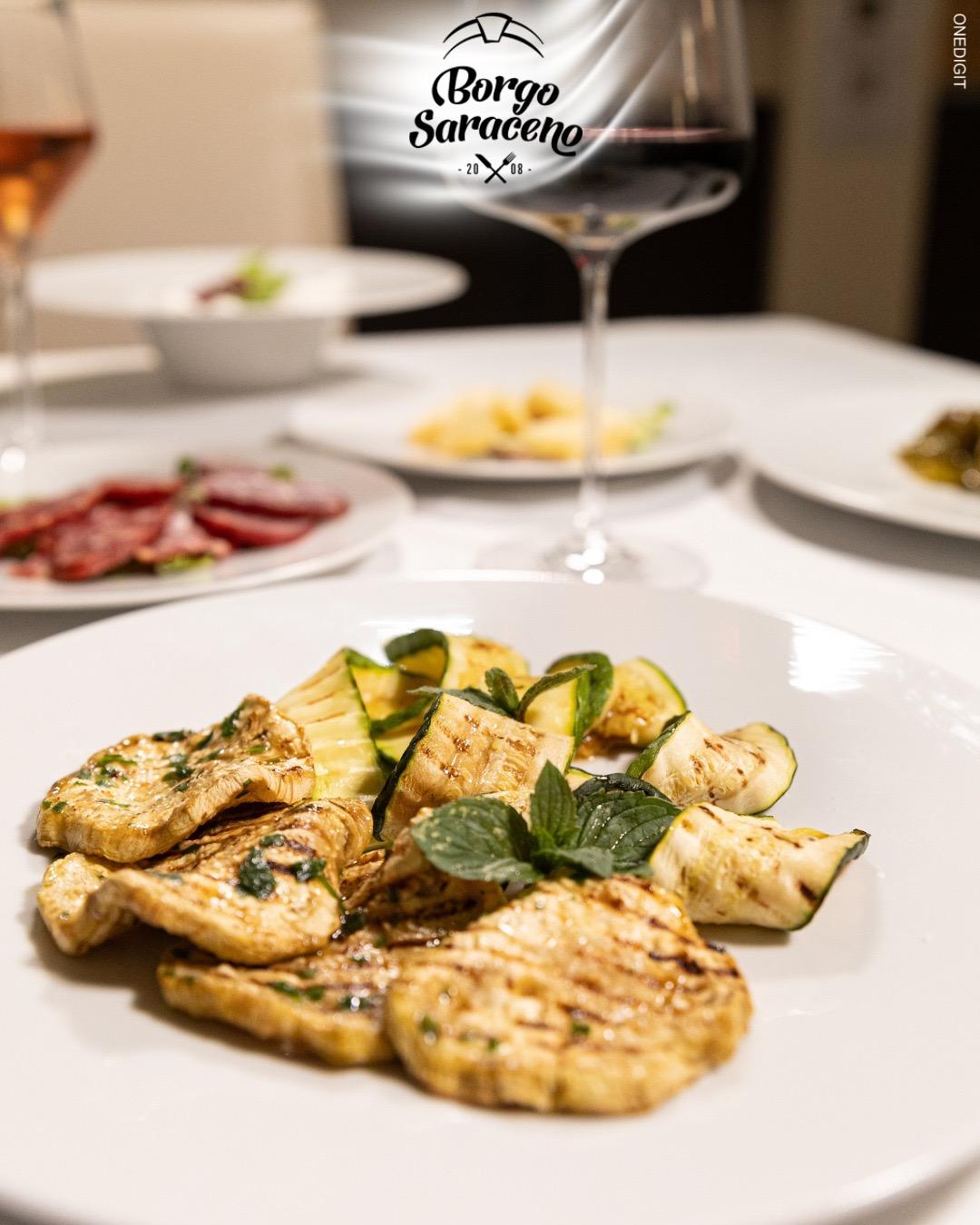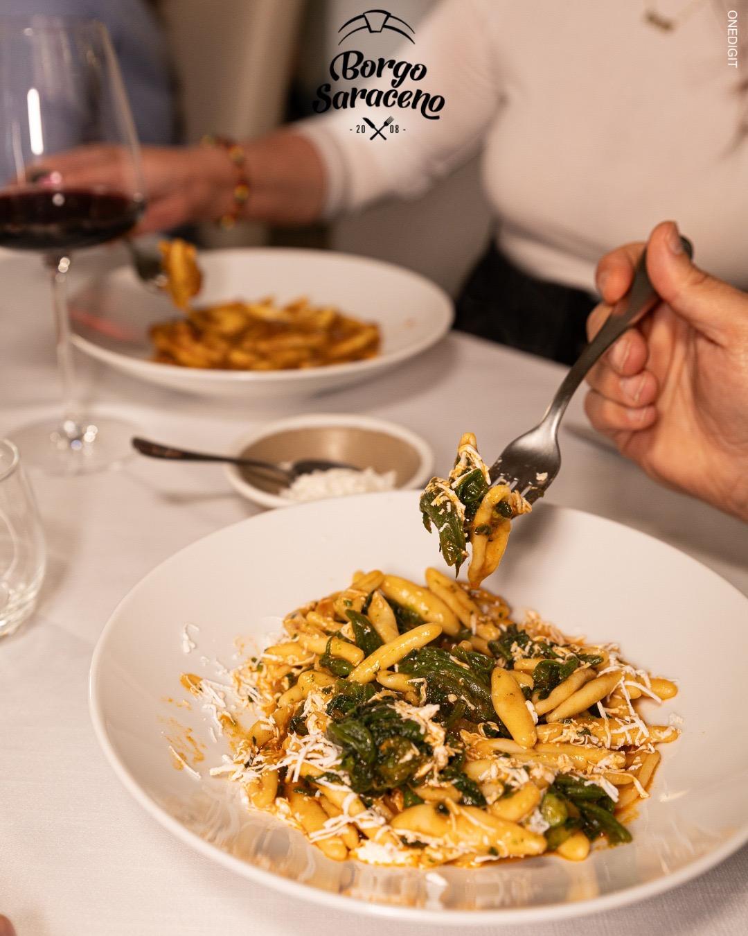 Das Ristorante Borgo Saraceno ist der ideale Ort, um die Küche der Region in einer warmen und authentischen Atmosphäre zu erleben, wo der Genuss am Tisch mit der Einfachheit der lokalen Traditionen verschmilzt. Hier wird jede Mahlzeit zu einem Moment, den man in Ruhe teilen kann, umgeben von echten Aromen und saisonal inspirierten Kombinationen, stets im Einklang mit der gastronomischen Kultur der Gegend.