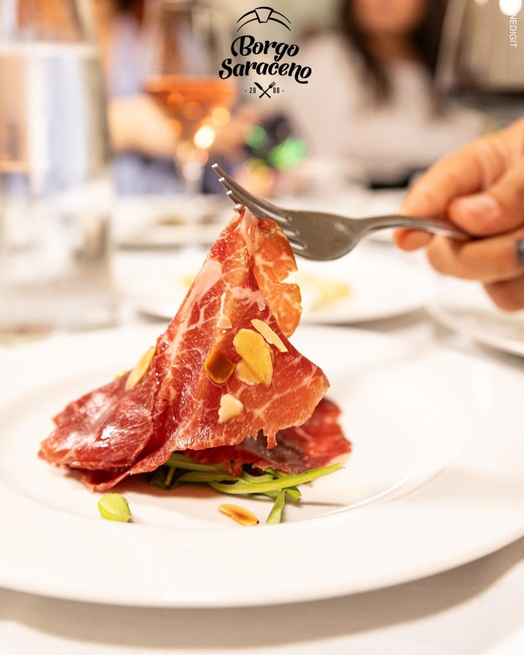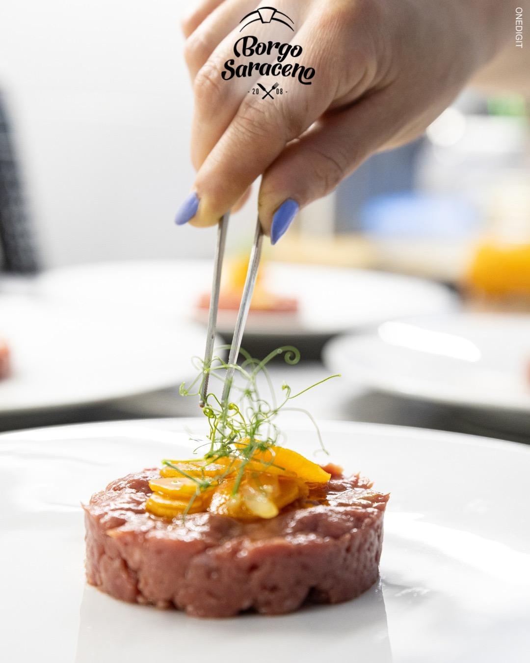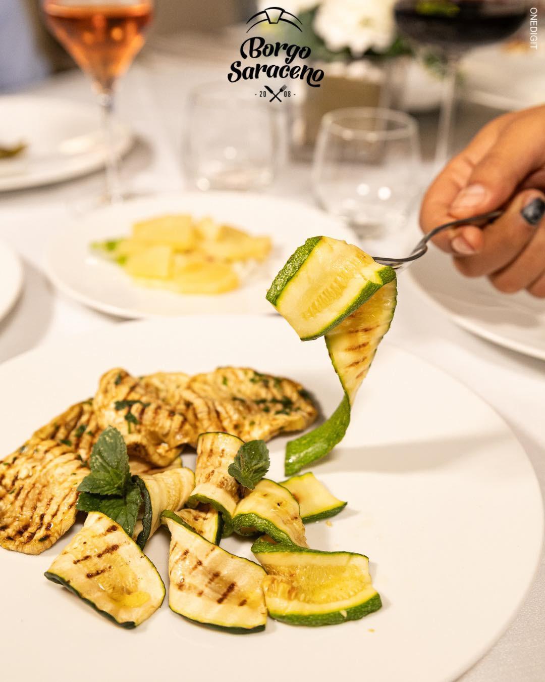 Das Ristorante Borgo Saraceno ist der ideale Ort, um die Küche der Region in einer warmen und authentischen Atmosphäre zu erleben, wo der Genuss am Tisch mit der Einfachheit der lokalen Traditionen verschmilzt. Hier wird jede Mahlzeit zu einem Moment, den man in Ruhe teilen kann, umgeben von echten Aromen und saisonal inspirierten Kombinationen, stets im Einklang mit der gastronomischen Kultur der Gegend.