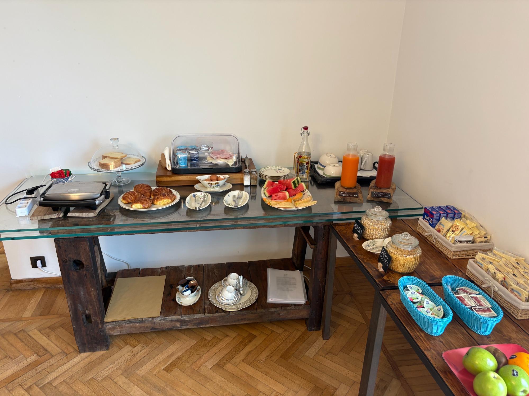 Frühstücksbuffet, das jeden Morgen von 8 bis 10 Uhr in unserem Salon oder auf der Terrasse mit Meerblick serviert wird. Frisch gebackene Brötchen, Toast, Brot, Marmelade, Honig, Nutella, Butter, Schinken und Käse, Natur- und Fruchtjoghurt, Müsli, Cornflakes, hartgekochte Eier sowie frisches Obst. Auf Anfrage sind glutenfreie Produkte erhältlich.