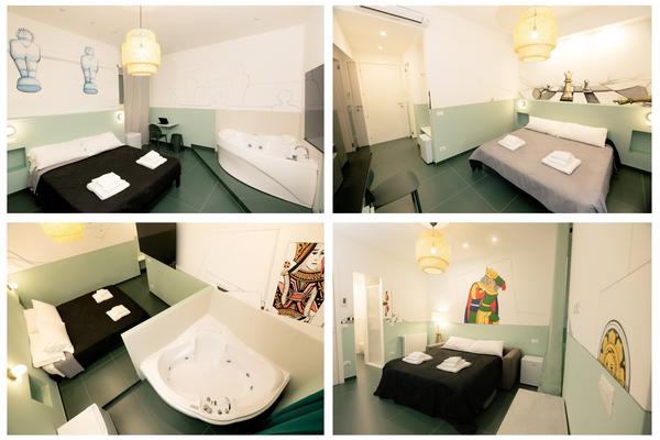 Each room includes an en-suite bathroom, a hydromassage shower, a 55" Smart TV, air conditioning, and wall paintings inspired by popular board games, all handcrafted by the Ruggieri Brothers.