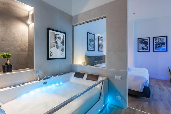 Luxury Suite SPA (fino a 4 posti letto) : Ampia sistemazione dotata di letto matrimoniale e divano letto. Dispone di una SPA privata interna ad uso esclusivo con Sauna, rituale del secchio a fiotto e Vasca Idromassaggio/Jacuzzi. La camera è inoltre equipaggiata con una Smart TV a schermo piatto da 100 pollici.
