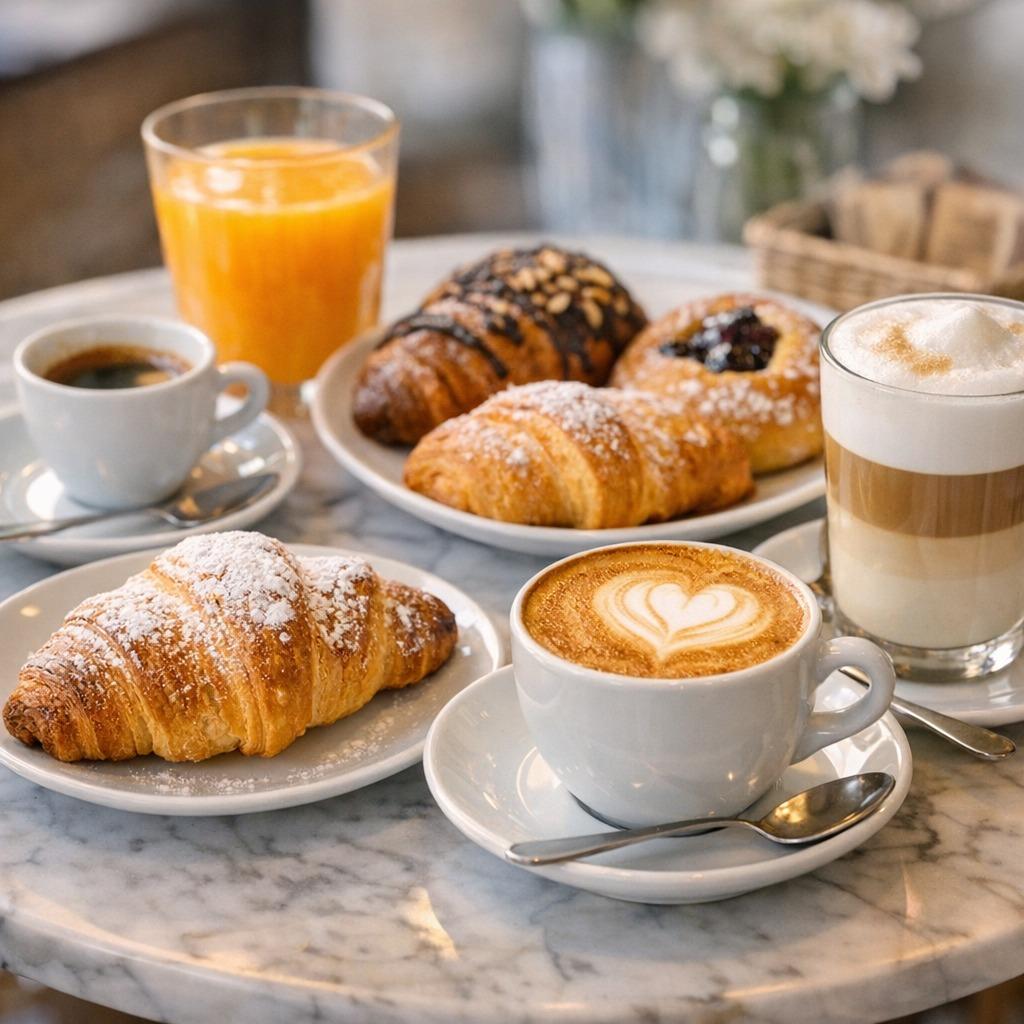 Ogni mattina potrai scegliere tra le bevande della migliore caffetteria italiana — espresso cremoso, cappuccino vellutato, latte macchiato o tè selezionati — accompagnate da un prodotto fresco di pasticceria: croissant fragranti, lievitati appena sfornati o dolci tipici che profumano di burro e vaniglia.